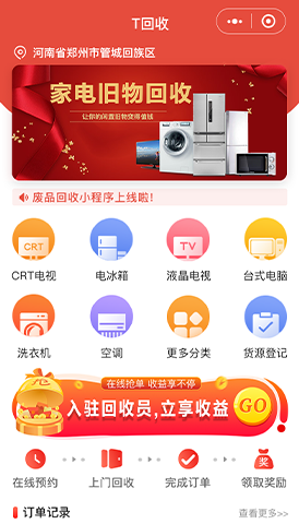 T回收是由汕頭市TCL德慶環(huán)保發(fā)展有限公司運(yùn)營的一款舊物家電回收小程序,功能簡單易上手,界面精美